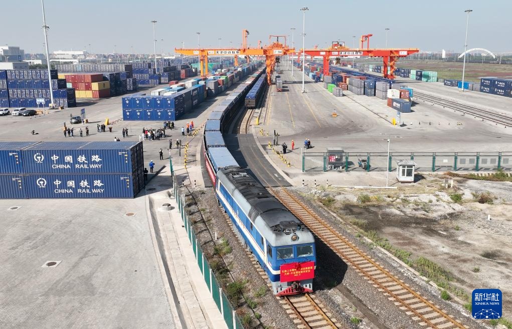 10月13日,拍摄了天津至中亚的土丁列车首趟运营(航拍图)。 10月13日,伴随着嘹亮的长鸣,满载家电、汽车配件等货物的中亚班列从中国铁路天津集装箱中心站出发,经霍尔果斯口岸出境,前往哈萨克斯坦等地。该班列共运载55个40英尺集装箱,运输周期约为10天。它将每周运行一次。这是中亚班列首次纳入从天津出发、途经霍尔果斯口岸的中亚班列。新华社李兰拍摄定于10月13日开行的天津至中亚班列(无人机照片)。 10月13日,伴随着嘹亮的长鸣,一列满载家电、汽车配件等货物的中亚班列从中铁天津集装箱中心站驶出,经铁路出境。离开霍尔果斯,前往哈萨克斯坦等地。该班列共运载55个40英尺集装箱,运输周期约为10天。它将每周运行一次。这是中亚班列首次纳入从天津出发、途经霍尔果斯口岸的中亚班列。 10月13日,新华社李兰首次拍摄到天津至中亚的定期列车照片。 10月13日,伴随着响亮而悠长的汽笛声,满载家电、汽车配件等货物的中亚班列从中国铁路天津集装箱中心站出发,经霍尔果斯口岸出境,前往哈萨克斯坦等地。该班列共运载55个40英尺集装箱,运输周期约为10天。它将每周运行一次。这是首次列入从天津出发、途经霍尔果斯口岸的中亚班列在计划的路线中。新华社李兰拍摄定于10月13日开行的天津至中亚班列(无人机照片)。 10月13日,伴随着嘹亮的长鸣,满载家电、汽车配件等货物的中亚班列从中国铁路天津集装箱中心站出发,经霍尔果斯口岸出境,前往哈萨克斯坦等地。该班列共运载55个40英尺集装箱,运输周期约为10天。它将每周运行一次。这是中亚班列首次纳入从天津出发、途经霍尔果斯口岸的中亚班列。新华社记者李兰拍摄了10月13日预定的天津至中亚班列运行情况(fdrone)。 10月13日,伴随着嘹亮的长鸣,一列满载家电、汽车配件等货物的中亚班列驶离中铁天津集装箱中心站。n,经霍尔果斯口岸出境,前往哈萨克斯坦等目的地。该班列共运载55个40英尺集装箱,运输周期约为10天。它将每周运行一次。这是中亚班列首次纳入从天津出发、途经霍尔果斯口岸的中亚班列。新华社记者 李兰 供图