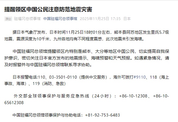 原标题:提醒领馆区中国公民警惕地震灾害。据日本气象厅消息,日本时间11月25日18时01分左右,熊本县阿苏地区发生震中深度10公里的5.7级地震。九州全境均有震感,但程度不同。这次地震没有引发海啸。中国驻福冈总领馆要求领区特别是熊本、大分县中国公民切实增强自卫意识,密切关注日方发布的地震预警、海啸警报和天气预报。如遇紧急情况,请立即报警并联系中国驻福冈总领馆。日本紧急热线:110、03-3501-0110(中文)、海外#9110、118(海上事故、沉船)、119(消防、急救) 外务省全球领事保护服务副紧急热线(24小时):+86-10-12308、+86-10-65612308 驻福冈总领馆领事保护支持热线:+81-92-753-6483 截图微信公众号截图